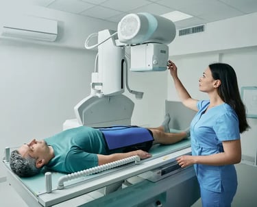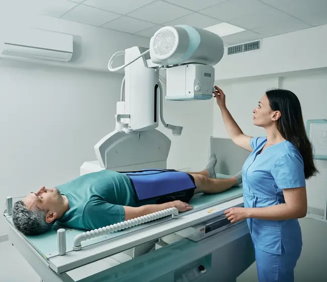 Es un estudio rápido e indoloro, tarda en realizarse entre 5 y 10 minutos dependiendo de la condición de la persona; los rayos X muestran el interior de su cuerpo en diferentes tonos de blanco y negro. Esto es debido a que diferentes tejidos absorben diferentes cantidades de radiación. El calcio en los huesos absorbe la mayoría de los rayos x, por lo que los huesos se ven blancos. La grasa y otros tejidos blandos absorben menos, y se ven de color gris. El aire absorbe la menor cantidad, por lo que los huesos se ven blancos. La grasa y otros tejidos blandos absorben menos, y se ven de color gris. El aire absorbe la menor cantidad, por lo que los pulmones se ven negros.